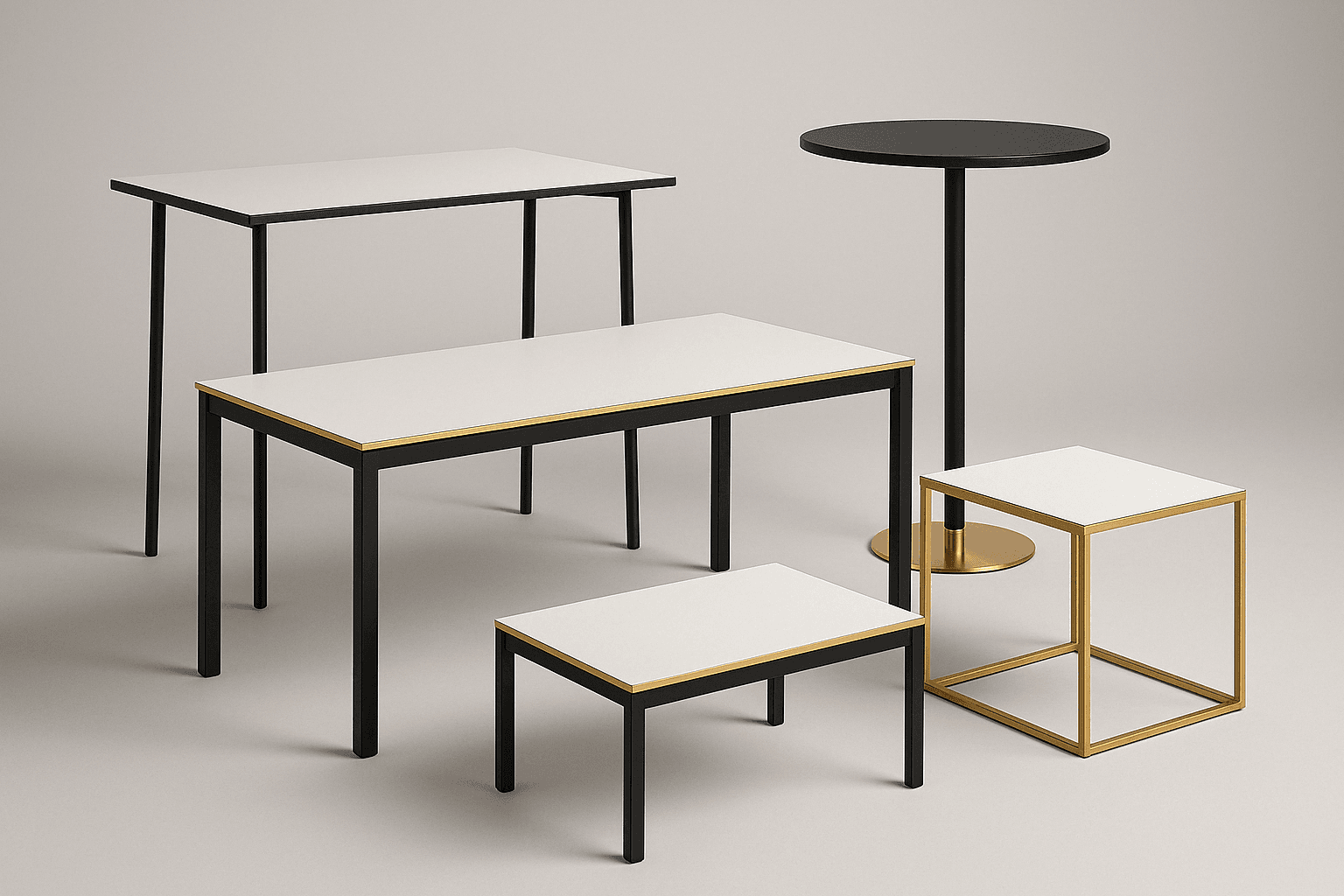 Tables B to B, tables basses, guéridons, tables hautes, mange-debout, tables de réunion, tables bureaux, tables de cérémonies & conférences, tables bar & buffets.