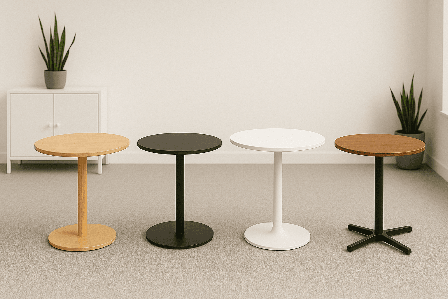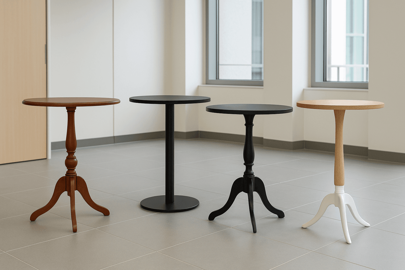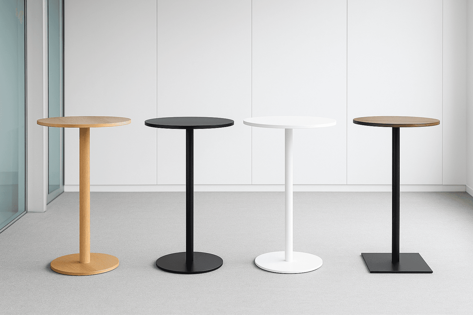 Tables ergonomiques pour espaces de networking, zones de pause et espaces de restauration debout.